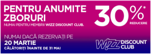 Dacă ești membru Wizz Discount Club, nu uita să arunci o privire pe promoția anunțată astăzi de Wizz Air: 30% Reducere din prețul total (inclusiv taxe) pentru anumite destinații dacă rezervați astăzi 20 Martie 2017. Există însă și câteva condiții: trebuie să zbori înainte de 31 mai 2017 și trebuie să fii memebru Wizz Discount Club