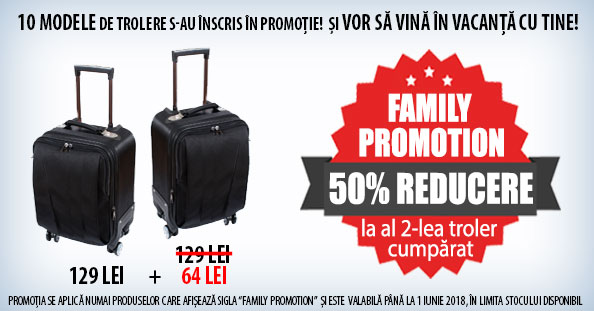 Profită de 50% REDUCERE din prețul celui de-al doilea troler, de același fel, pe care îl cumperi de la Travelkit. Reducerea se aplică automat în magazinul online, atunci când comanzi 2 trolere identice, în aceeași comandă. Promoția este valabilă până la 1 iunie 2018, în limita stocului disponibil.