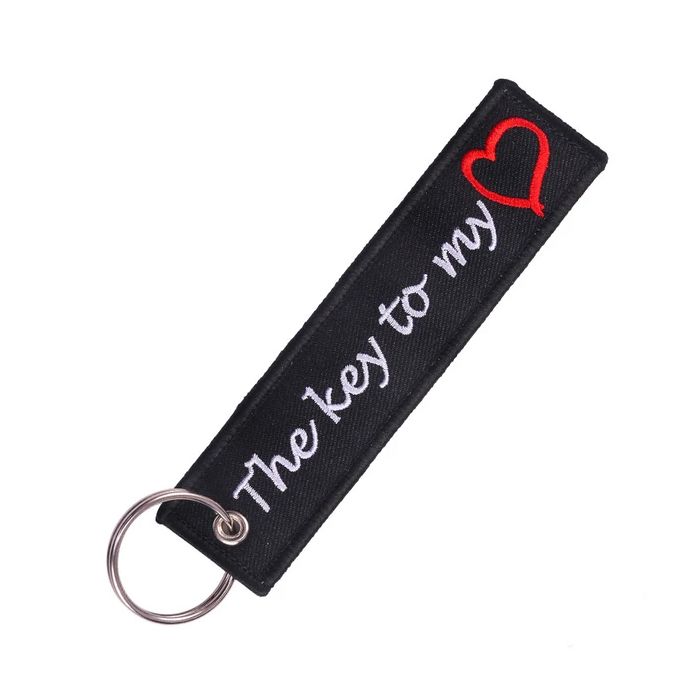 Tag textil negru inscriptionat "The Key To My Heart" din colectia Travelkit, pe care il poti folosi ca breloc pentru chei sau cu care poti decora diferite genti, bagaje sau chiar outfit-uri. Este un mod prin care poti sa-ti afirmi originalitatea si individualitatea discret dar totusi vizibil.