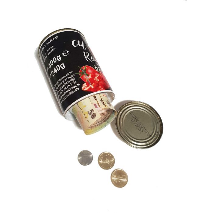 Cutie de valori secretă, deghizată într-o conservă "Roșii cuburi în sos de rosii" cu eticheta reducere de pret "mai ieftin" pentru mai mult realism.