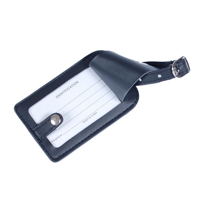 Eticheta este confectionata din piele ecologica de culoare neagra si ofera posibilitatea de acoperire a informatiilor personale prin glisarea partii superioare.