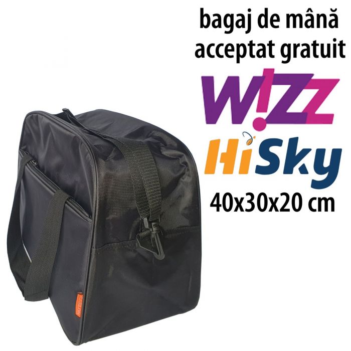 Dimensiunile acestei genți de umăr se încadrează în dimensiunile specificate de Wizz Air și HiSky pentru bagajele de mână acceptate gratuit 40x30x20 cm.