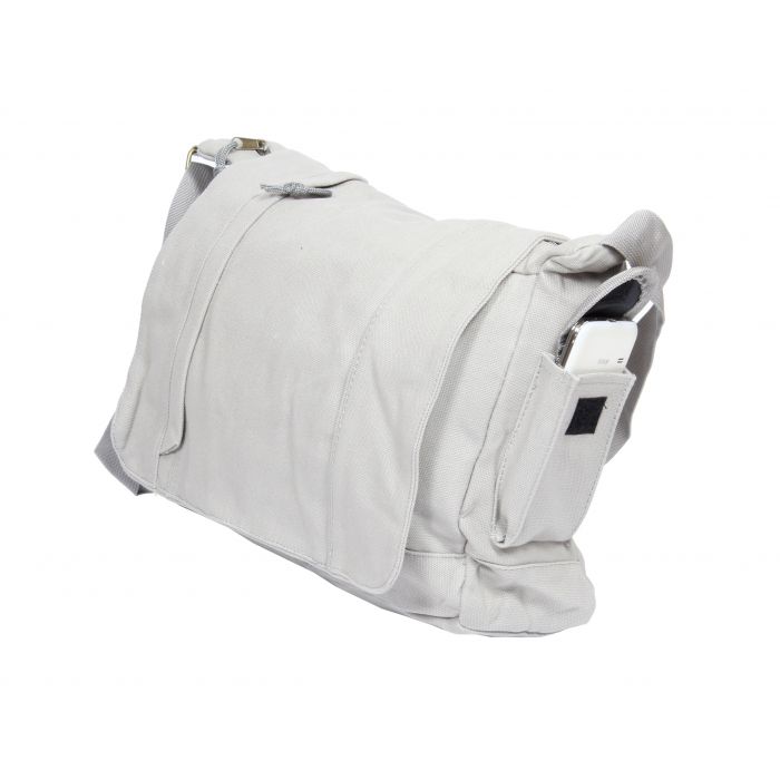 Geanta este confecționată din canvas și are culoarea crem. Este prevăzută cu un buzunar lateral pentru un telefon mobil sau alt accesoriu similar ca dimensiune.