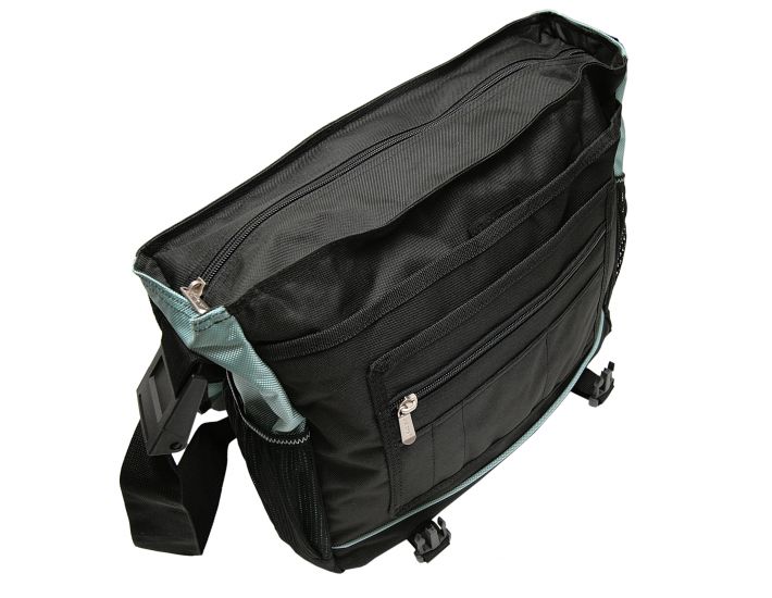 - pe partea din fata buzunar compartimentat astfel, buzunar spatios cu sistem inchidere arici si alte spatii pentru depozitare pixuri, documente etc