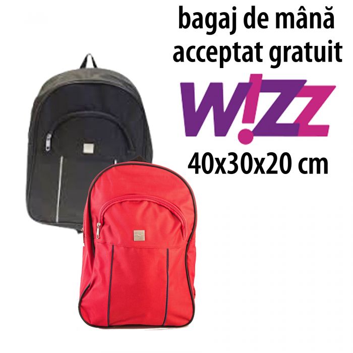 Rucsac de mici dimensiuni care poate fi adus gratuit la bordul aeronavelor Wizz Air / Bleu Air / Ryanair / Tarom etc. ca și bagaj de mână. Este fabricat din polyester rezistent și e prevăzut cu un compartiment principal și un buzunar mare cu fermoar în partea din față. Include de asemenea un mâner confecționat din material rezistent.