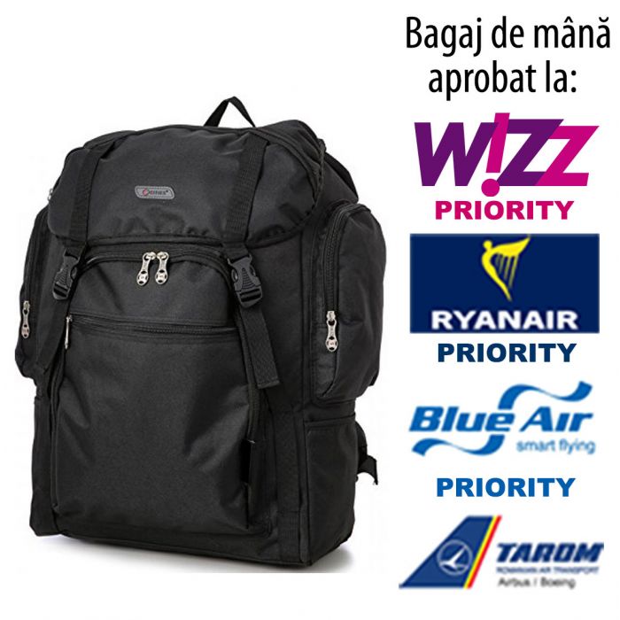- 55x40x20cm = dimensiunea maximă acceptată pt. bagajul de mână gratuit la Blue Air, Ryanair Priority, Tarom, Air Serbia, Aeroflot, Pegasus și se încadrează în dimensiunea maxim admisă la Wizz Air Priority, British Airways, Austrian, Lufthansa, Aegean, LOT, FlyDubai, Turkish Airlines