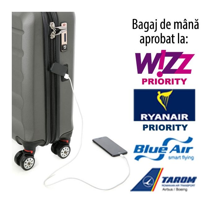 - ECHIPAT CU PORT USB PT. ÎNCĂRCARE: pur și simplu conectează-ți bateria externă (buzunar special disponibil în interiorul trolerului) și încarcă-ți telefonul sau tableta în timp ce călătorești
