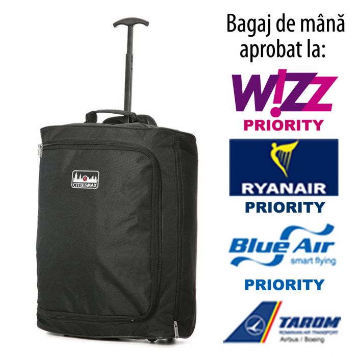 - Luați maxim de bagaje cu dvs.! Măsoară 55x40x20cm = dimensiunea maximă acceptată pt. bagajul de mână gratuit la Blue Air, Ryanair, Tarom, Air Serbia, Aeroflot, Pegasus și se încadrează în dimensiunea maxim admisă la Wizz Air, British Airways, Austrian, Lufthansa, Aegean, LOT, FlyDubai, Turkish Airlines