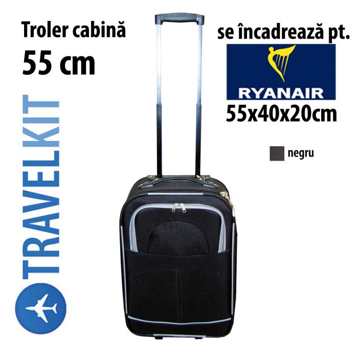Troler 54 cm de cabină pt. Ryanair - poate fi folosit ca bagaj de mână. Acest troler face parte din gama noastră accesibilă, măsoară 55x35x18 cm și este fabricat din poliester de culoare neagră, cu elemente gri.