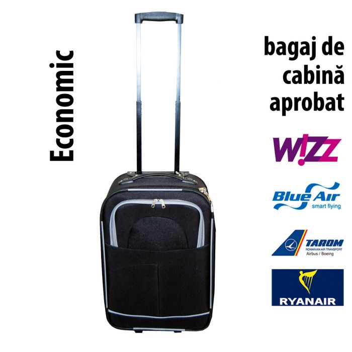 Troler 55 cm de cabină - poate fi folosit ca bagaj de mână pentru majoritatea liniilor aeriene, cu câteva excepții. Acest troler face parte din gama noastră accesibilă, măsoară 55x35x18 cm șeste fabricat din poliester de culoare neagră.