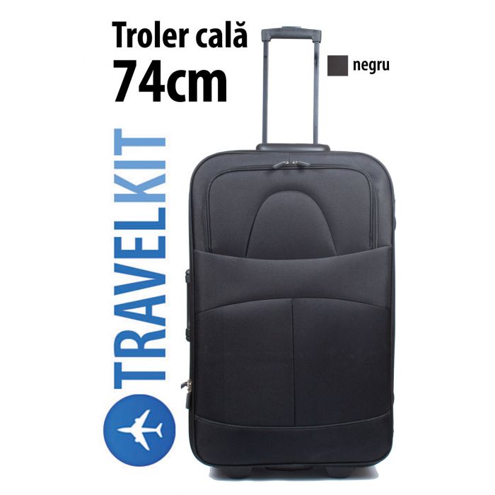 Troler 74 cm de cală - poate fi folosit ca bagaj de cală pentru majoritatea liniilor aeriene. Acest troler face parte din gama noastră accesibilă, măsoară 74x45x22 cm și este fabricat din poliester de culoare neagră.