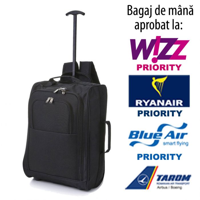 Măsurând 55x35x20cm, se încadrează în dimensiunile bagajului de mână gratuit la mai toate liniile aeriene, inclusiv Wizz Air (Priority), Blue Air (Priority), Ryanair (Priority), Tarom, Air France, British Airways, KLM, Lufthansa etc. oferindu-vă în același timp un spațiu de depozitare substanțial, de 42 L.