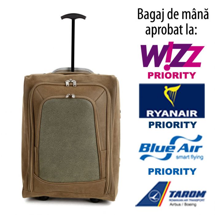 Troler Vogue 50cm pt cabină - confecționat din material ecologic cu aspect de piele întoarsă. Poate fi folosit ca bagaj de mână pentru majoritatea liniilor aeriene.Este prevăzut cu mâner telescopic ce poate fi ascuns într-un buzunar special atunci când nu este folosit, roți rezistente și silențioase, un buzunar frontal ce se închide cu fermoar și 2 mânere retractabile.